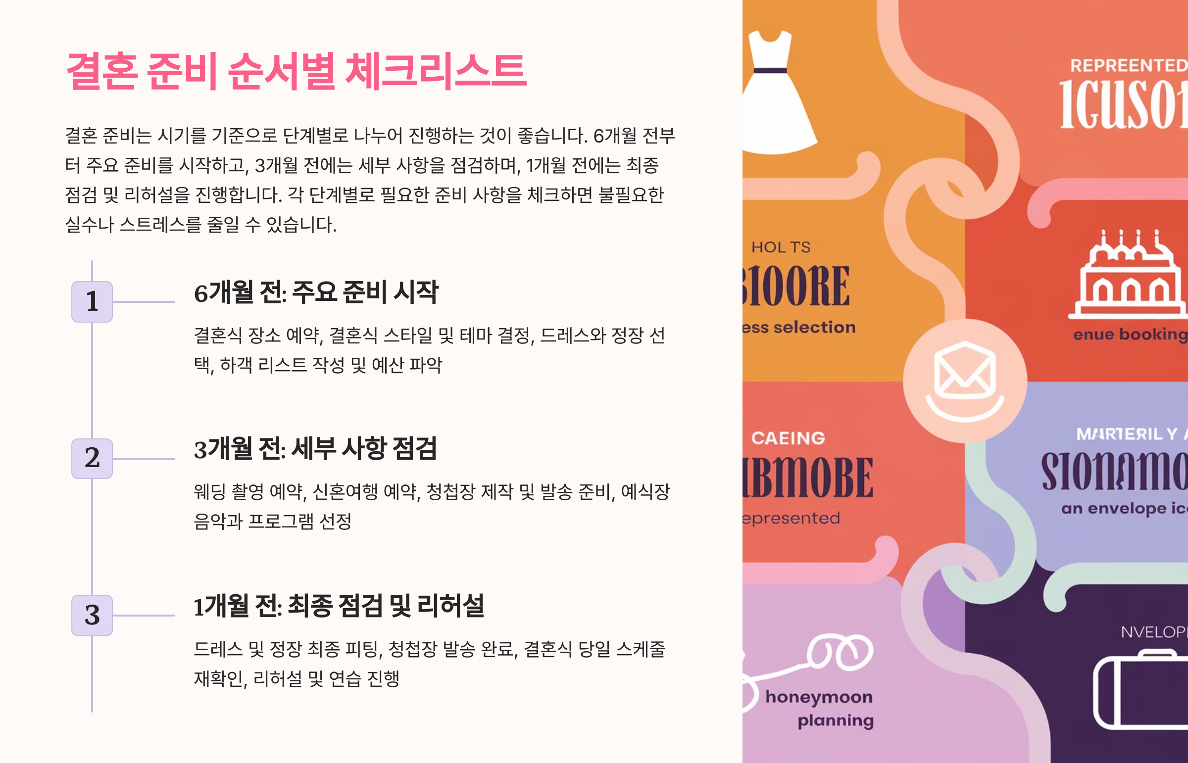 결혼 준비는 큰 행사이므로, 단계별로 차근차근 준비하는 것이 중요합니다. 위의 체크리스트를 통해 결혼 준비 순서에 맞춰 진행하고, 각 단계를 완료할 때마다 하나의 성취감을 느껴보세요. 이 가이드가 여러분의 결혼 준비에 도움이 되기를 바랍니다.