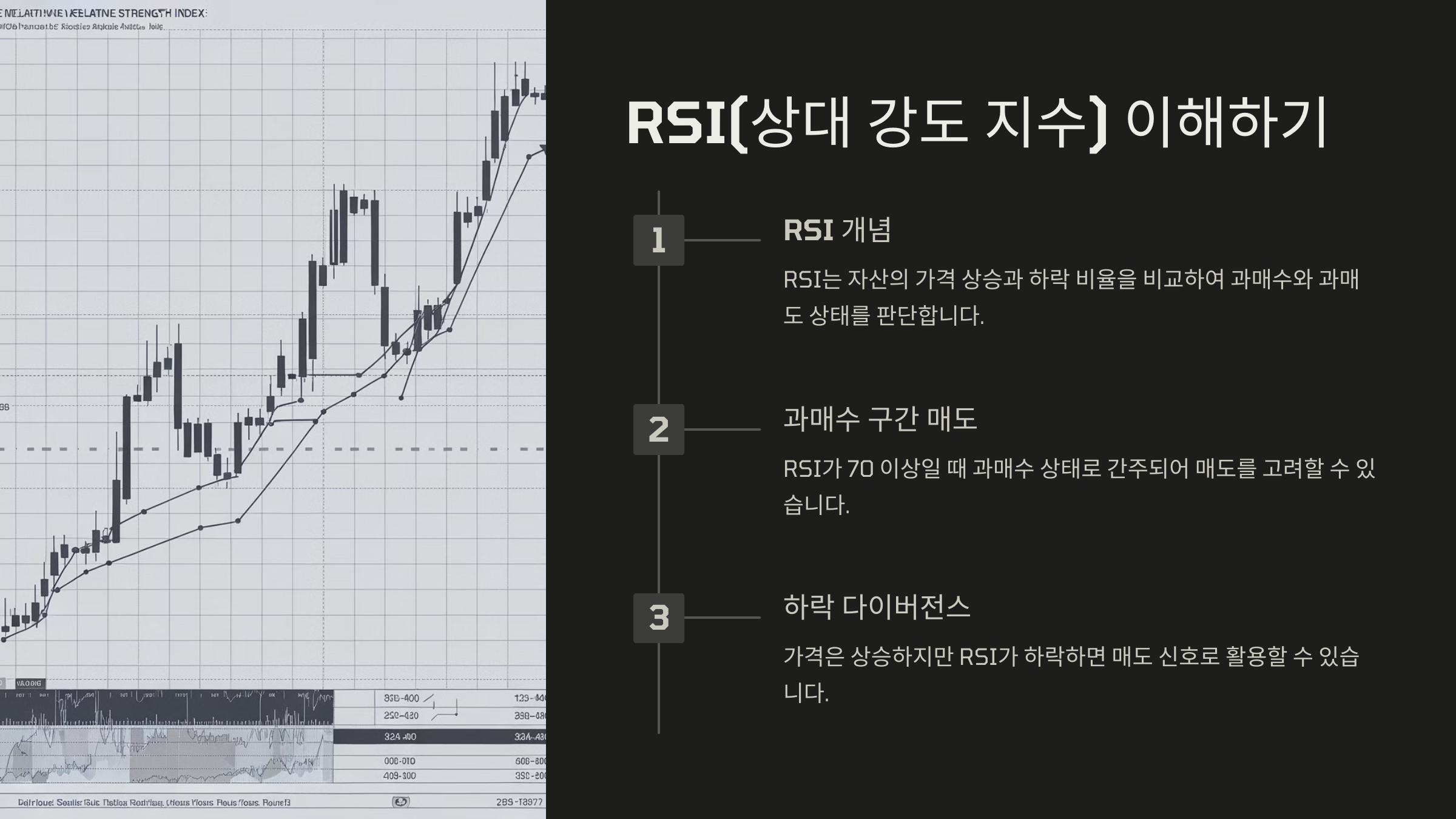 RSI(Relative Strength Index)는 특정 기간 동안 자산의 가격 상승과 하락 비율을 비교하여 과매수와 과매도 상태를 판단하는 지표입니다. 이 지표는 주로 14일을 기준으로 설정되며, 0에서 100까지의 값을 가지게 됩니다. 일반적으로 RSI 값이 70 이상일 경우 과매수 상태로 간주되어 자산의 가격이 과대평가될 수 있는 시점으로 해석합니다. 반대로 RSI가 30 이하일 때는 과매도 상태로 간주되어 자산의 가격이 저평가된 것으로 볼 수 있습니다.