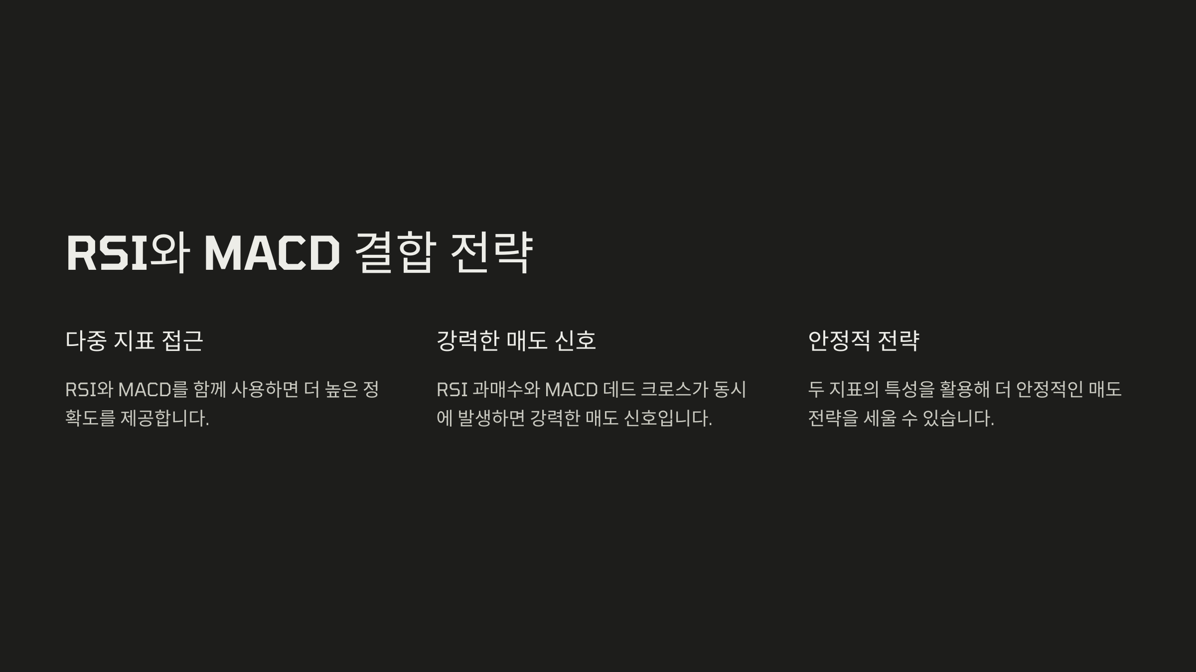 단일 지표만을 사용하는 것보다 RSI와 MACD를 함께 사용하는 것이 더 높은 정확도를 제공합니다. 예를 들어, RSI가 과매수 구간에 진입한 상태에서 MACD 또한 데드 크로스가 발생하면 매우 강력한 매도 신호로 해석될 수 있습니다. 이처럼 두 지표를 결합하여 매도 신호를 확인함으로써 타이밍을 더 효과적으로 판단할 수 있습니다. 이러한 다중 지표 접근법은 오판을 줄이고 매도 타이밍의 정확도를 높이는 데 도움이 됩니다. 각 지표의 특성을 최대한 활용해 더 안정적인 매도 전략을 세울 수 있습니다.
