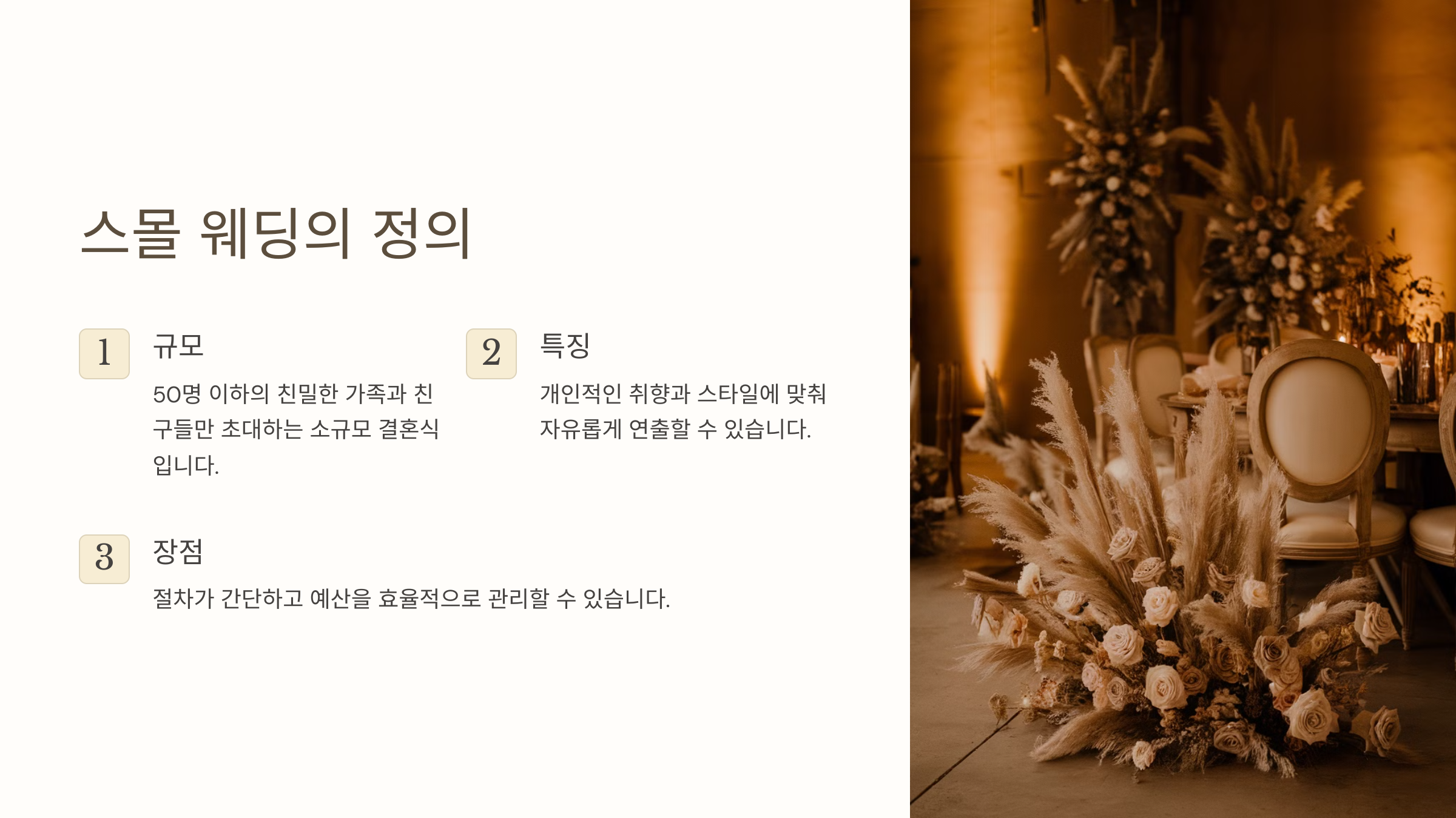 이 표를 통해 스몰 웨딩이 경제적이고, 자유로운 연출이 가능하다는 점을 쉽게 파악할 수 있습니다.