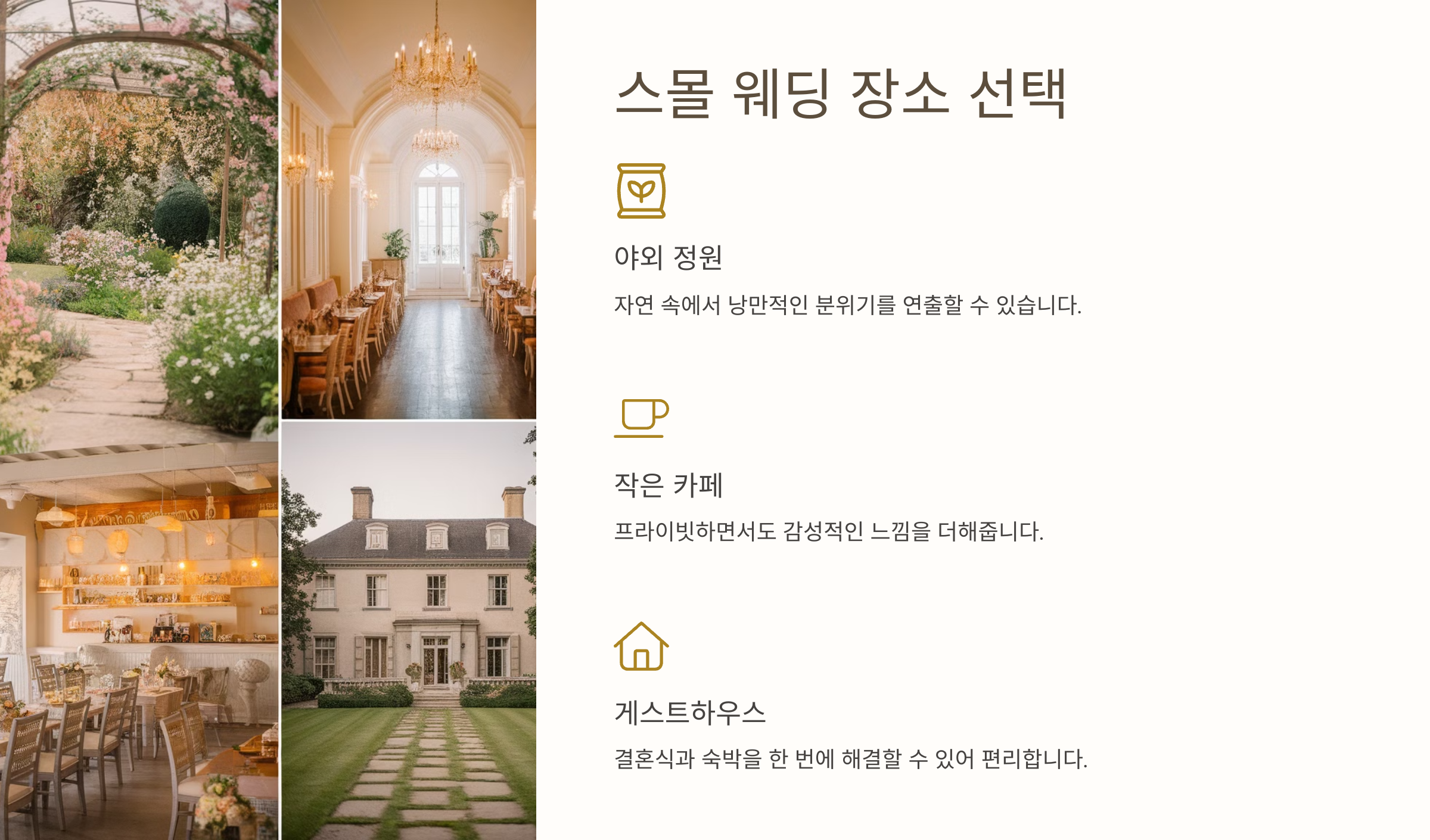 - 작은 카페: 카페에서 진행되는 웨딩은 프라이빗하면서도 감성적인 느낌을 더해 줍니다. 특히 인테리어가 멋진 카페를 선택하면 별도의 장식 없이도 세련된 분위기를 낼 수 있습니다.