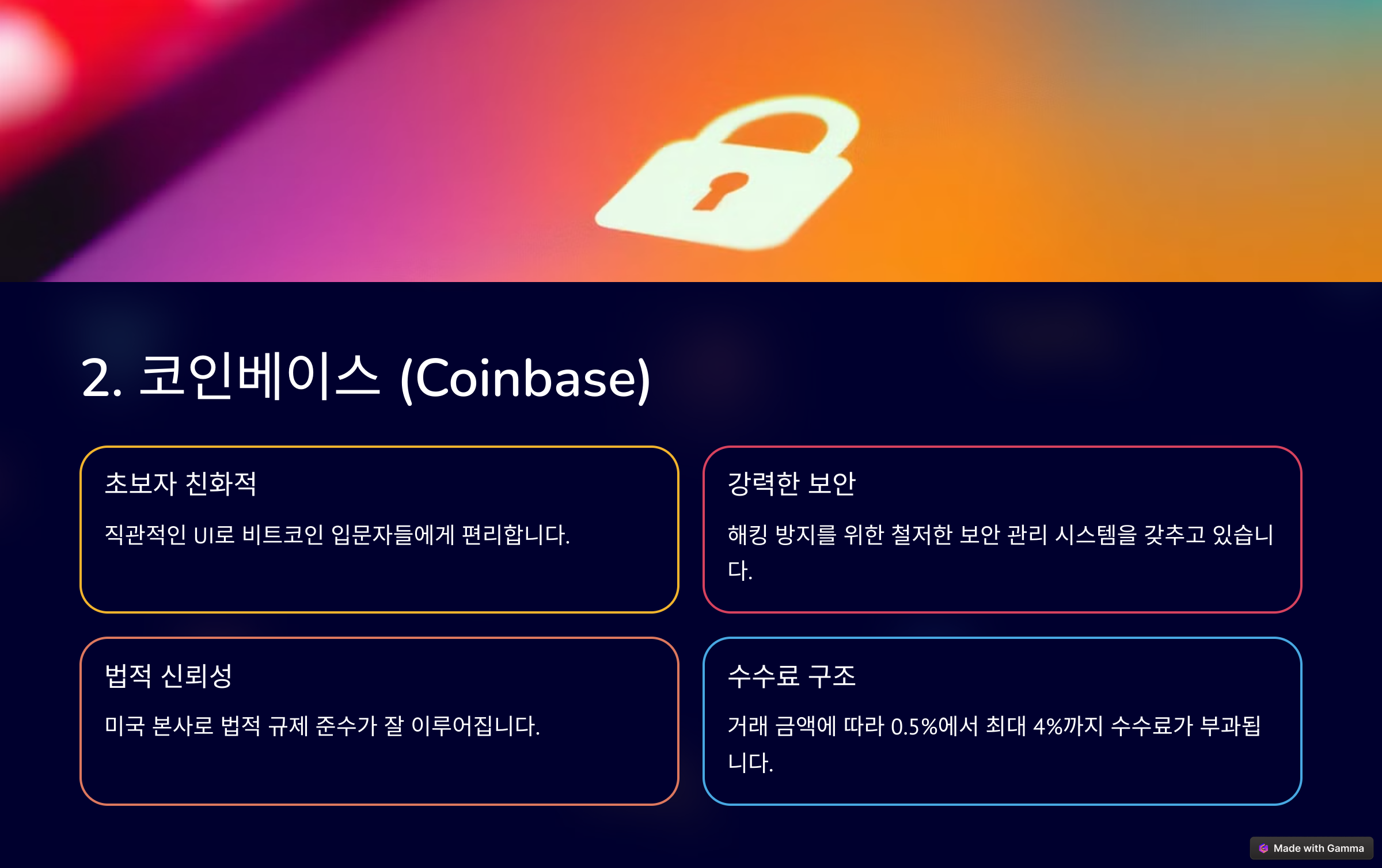 코인베이스는 직관적인 인터페이스와 보안성이 강점이지만 수수료가 높고 거래 가능한 암호화폐 종류가 비교적 적다는 단점이 있습니다. 초보자와 규제에 민감한 사용자를 위한 안정적인 거래소로 평가받고 있습니다.