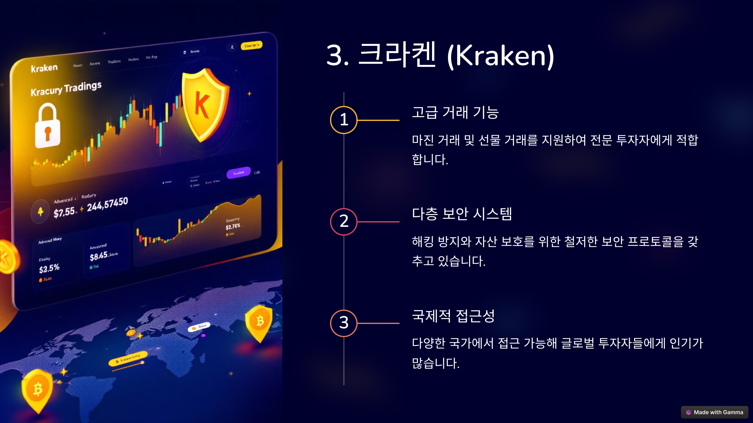 크라켄은 고급 기능과 다양한 보안 옵션을 제공하며, 국제적으로 접근성이 높아 폭넓은 투자자층을 확보하고 있습니다. 다만 고객 지원 응답이 느리다는 점은 아쉬운 부분입니다.