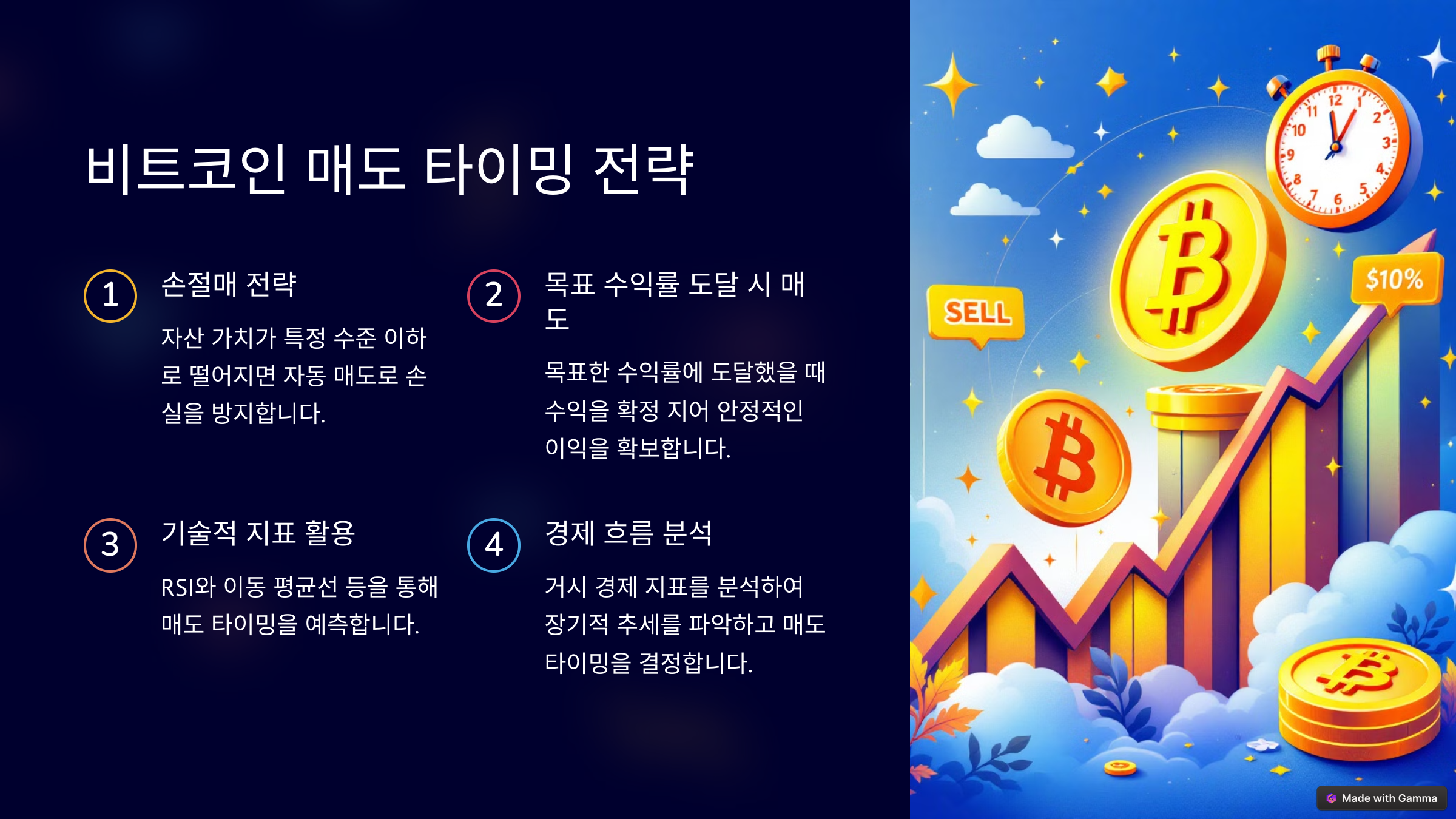 - 경제 흐름 분석: 거시 경제 지표를 분석하여 장기적 추세를 파악하고 이를 통해 매도 타이밍을 결정합니다.